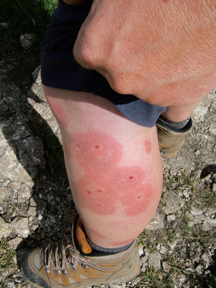 In 2009 we went on a holiday to the Dolomite mountains. Prior to going on holiday, we had been wild camping on Dartmoor and I had removed three ticks when we returned home and thought nothing more about it. When we went to Italy I had also got bitten by a few mosquitos. My Bites started to inflame and I became bedridden for 24 hours with a fever and sickness. When I stopped being sick I was left with overwhelming fatigue and pain in both my legs due to swelling. This is a picture of my legs a few days after being bitten.